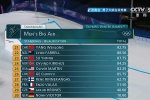 冬奥会单板滑雪男子大跳台预赛次轮:苏翊鸣完美第2跳 葛春宇出局