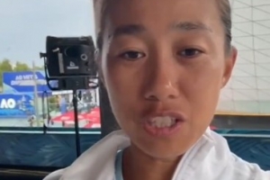 张帅赛后感谢球迷:“哈喽大家好,我是张帅。我现在在墨尔本的澳网。我和梅尔滕斯,我们刚刚赢得了女双半决赛,然后进入到了决赛。这是我们两个人第二次参加大满贯的比赛一起,然后第二次打入决赛。