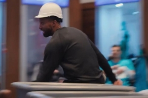 GIF-查尔斯·李赛后戴着建筑工人的帽子在更衣室狂奔庆祝