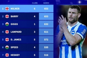 体育资讯2月12日讯 布莱顿在本轮英超对阵阿斯顿维拉,40岁米尔纳替补出战。数据统计显示,他也追平巴里并列英超历史出场王。