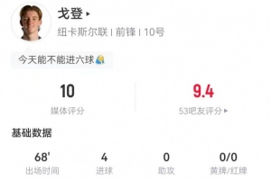 体育资讯2月19日讯 纽卡在本轮欧冠附加赛首回合大比分领先卡拉巴赫,戈登本场数据如下: