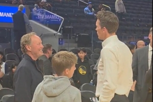 赛前,目前赋闲在家的冠军教练布登霍尔泽出现在场边,和勇士总经理邓利维交流。