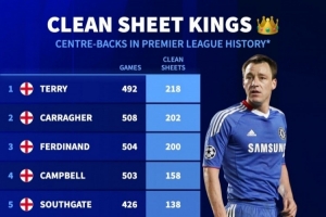 体育资讯2月20日讯 德国转会市场统计了英超历史中卫零封的场次,并列出榜单,特里218场居首,卡拉格、费迪南德二三位。