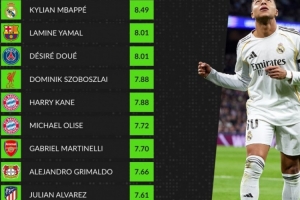 本赛季欧冠16强球员场均评分榜:姆巴佩居首,亚马尔、杜埃前三