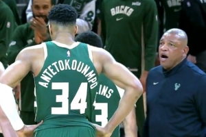 GIF-雄鹿落后20分 里弗斯和字母哥沟通 后者直接忽视