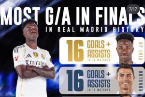 体育资讯01月23日讯 维尼修斯更新社媒,晒出自己在皇马队史决赛进球+助攻数的排名,他本人以16个进球+助攻与C罗、本泽马和普斯卡什并列榜首!