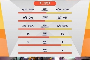 第一节,青岛进攻乏力,全队15投6中,命中率40%,三分7中0,罚球6中3,命中率也只有50%。