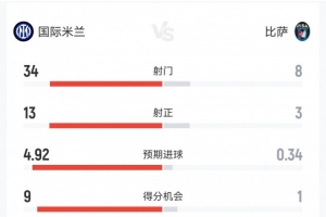 你先动手的!国米6-2比萨数据:射门34-8,射正13-3,得分机会9-1