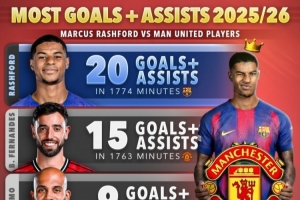 本赛季拉什福德1774分钟参与20粒进球,多于任何曼联球员
