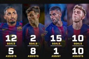巴萨本赛季8名球员参与进球10+:亚马尔、拉什福德、费尔明在列