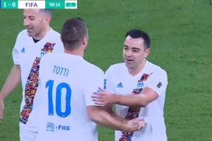 比赛中,托蒂与哈维两人连线,最终哈维轻巧挑射破门。