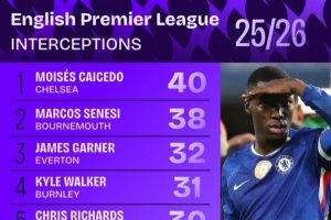 体育资讯1月27日讯 Squawka统计了本赛季球员在英超的拦截次数,并列出榜单,凯塞多40次居首。